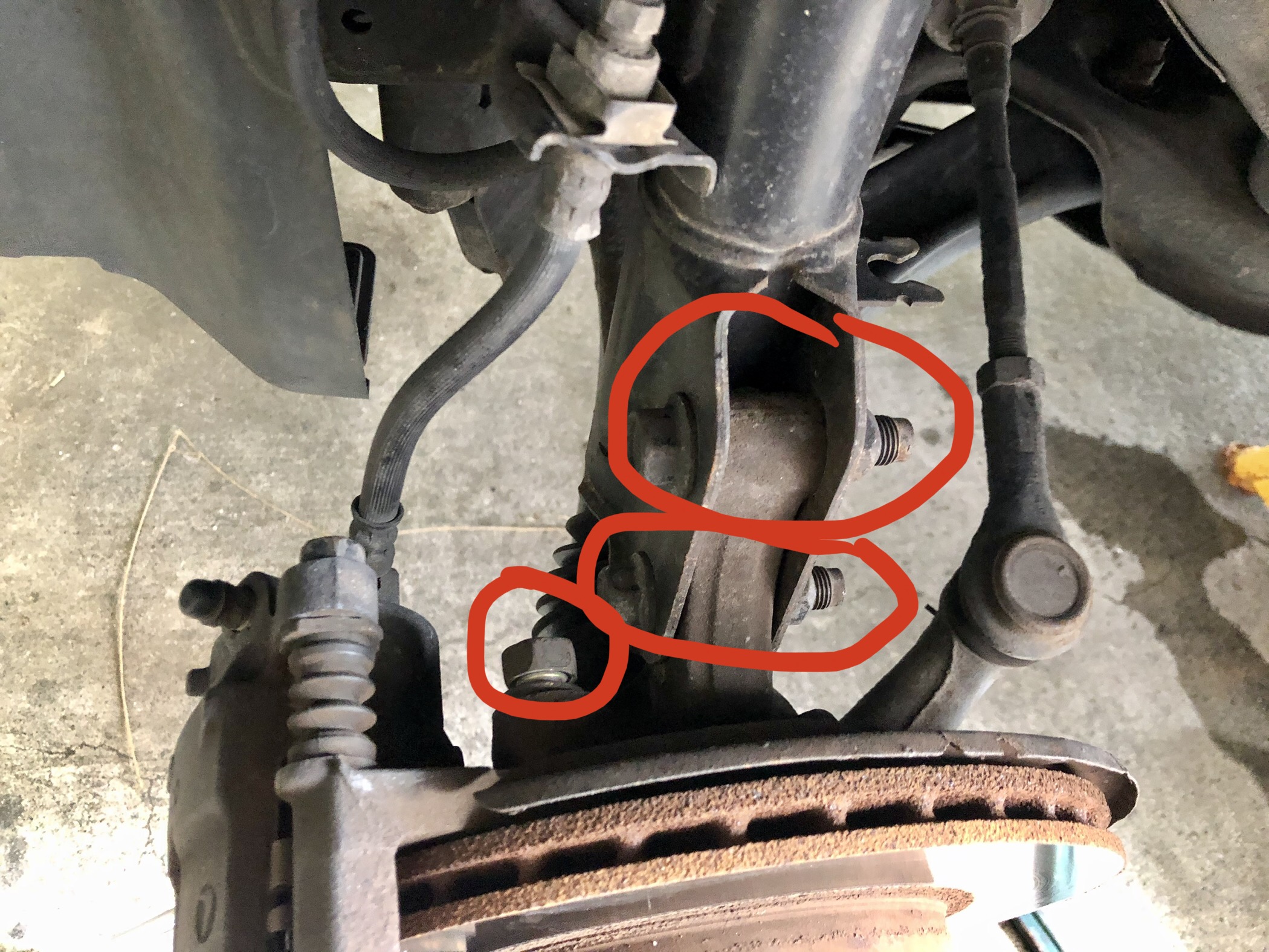 赤○の14ミリのボルト・ナットを緩めます。その後バールでロアアームとハブの間をこじって分離します。