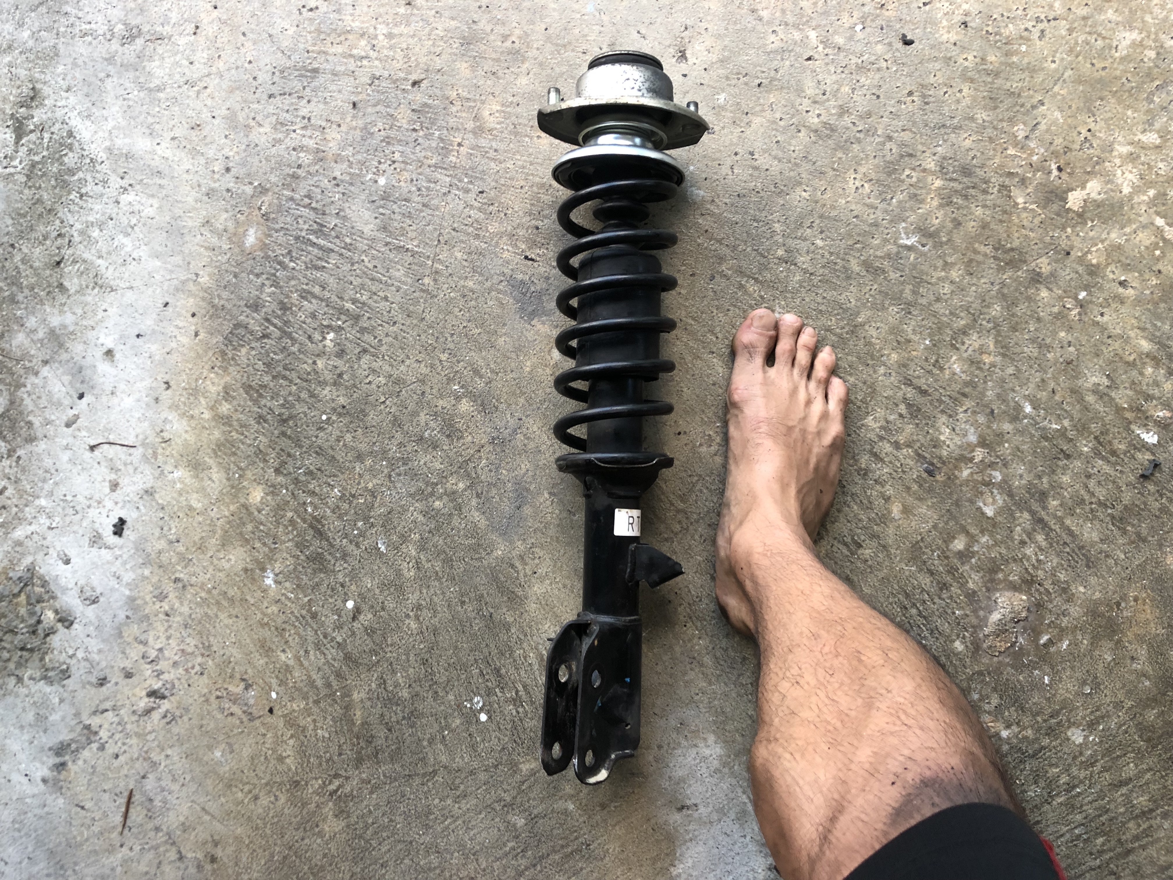 でないと、アッパーマウント固定ナットにアクセスできません。電動インパクトがないので車輌に固定されている状態で少し緩めます。