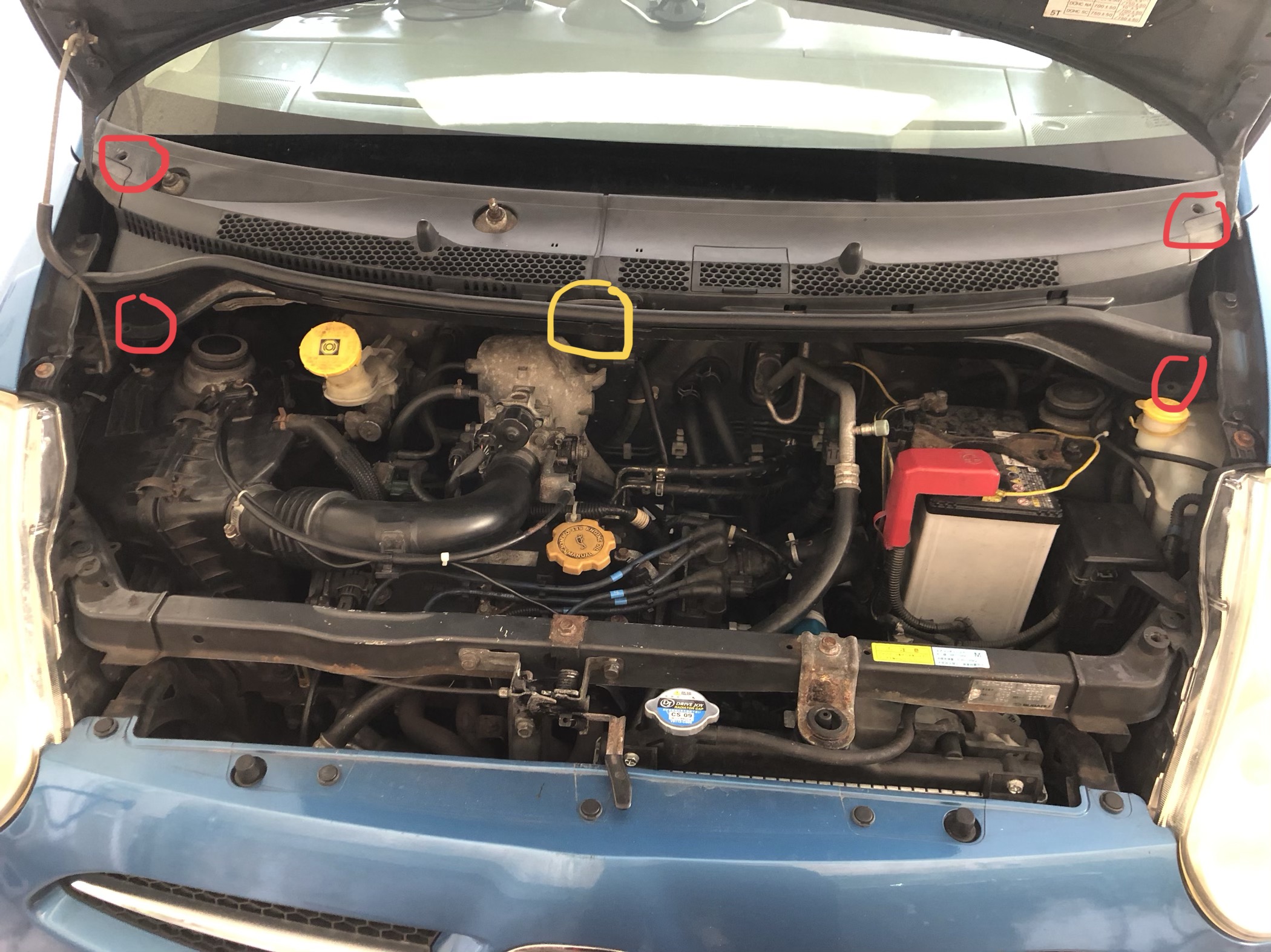 ストラット交換だけならカウルトップ(ワイパー周りの樹脂カバー)はバラさなくても作業できますが、僕はフロントショックがどれくらい抜けてるのか確認したいのでカウルトップもバラしました。